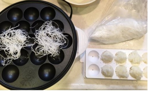 原案通り、たこ焼き器でも作ろうとしてのですが、へこみに合う押さえる物がなく、ご飯ボールを投入する始末です。