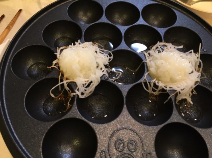 1.同じように片栗粉をまぶした大根を油を中程まで入れたたこ焼き器の上に鳥の巣のように散らします。