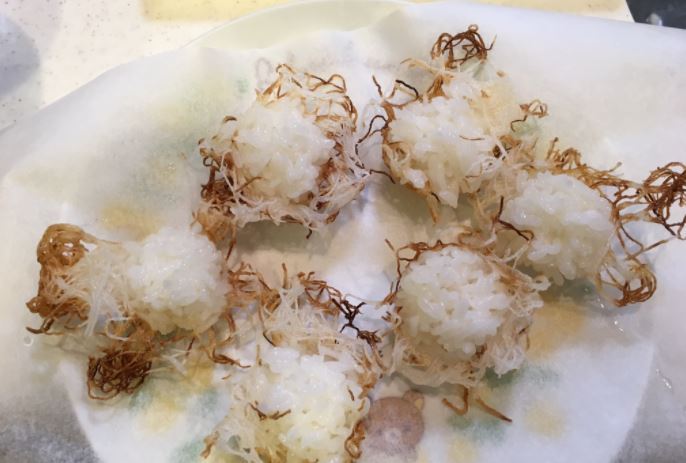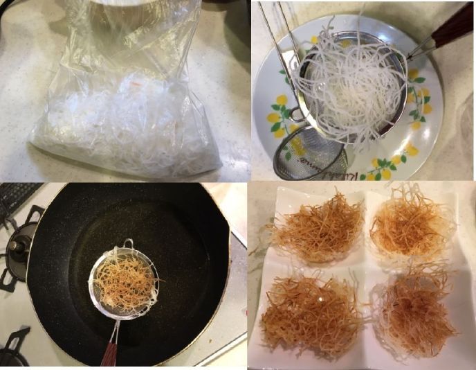 2.鳥の巣の中心にごはんを投入し、揚げます。
