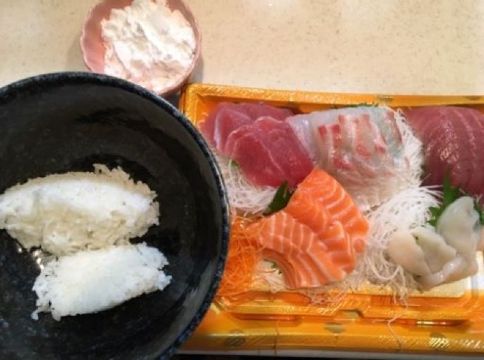材料:刺身盛り合わせ、ごはん、寿司酢、片栗粉、