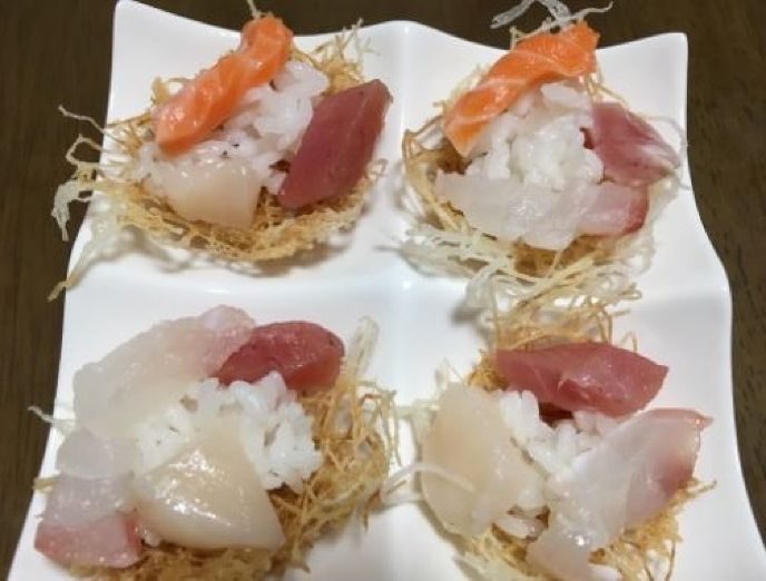 4.寿司酢と米を合わせて作った酢飯を鳥の巣に乗せ、刺身を盛れば完成です。