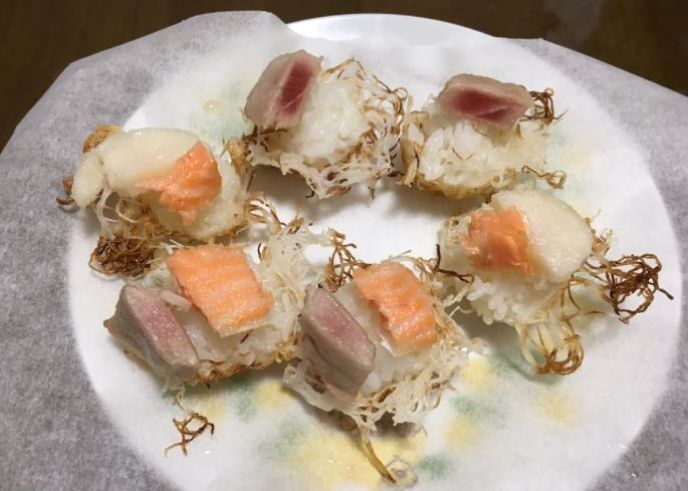 4.取り出した鳥の巣ごはんの上に切った刺身を盛れば完成です。