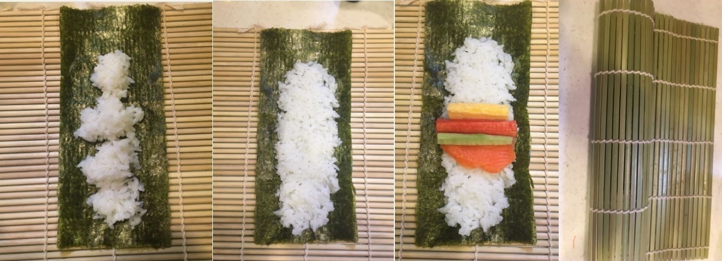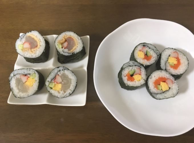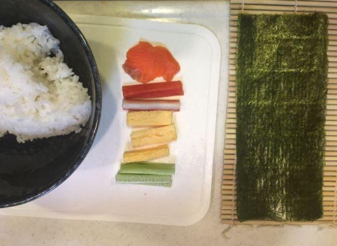 材料:ご飯、寿司酢、海苔、お好みの具(今回はキュウリとカニカマと卵焼きとサーモンを用意しました)