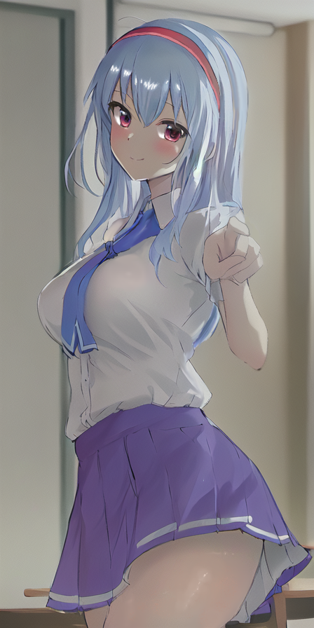 白いさらさらの白銀色のロングヘアに赤いカチューシャ、目鼻立ちは整っており控え目に言って色白だし美人。