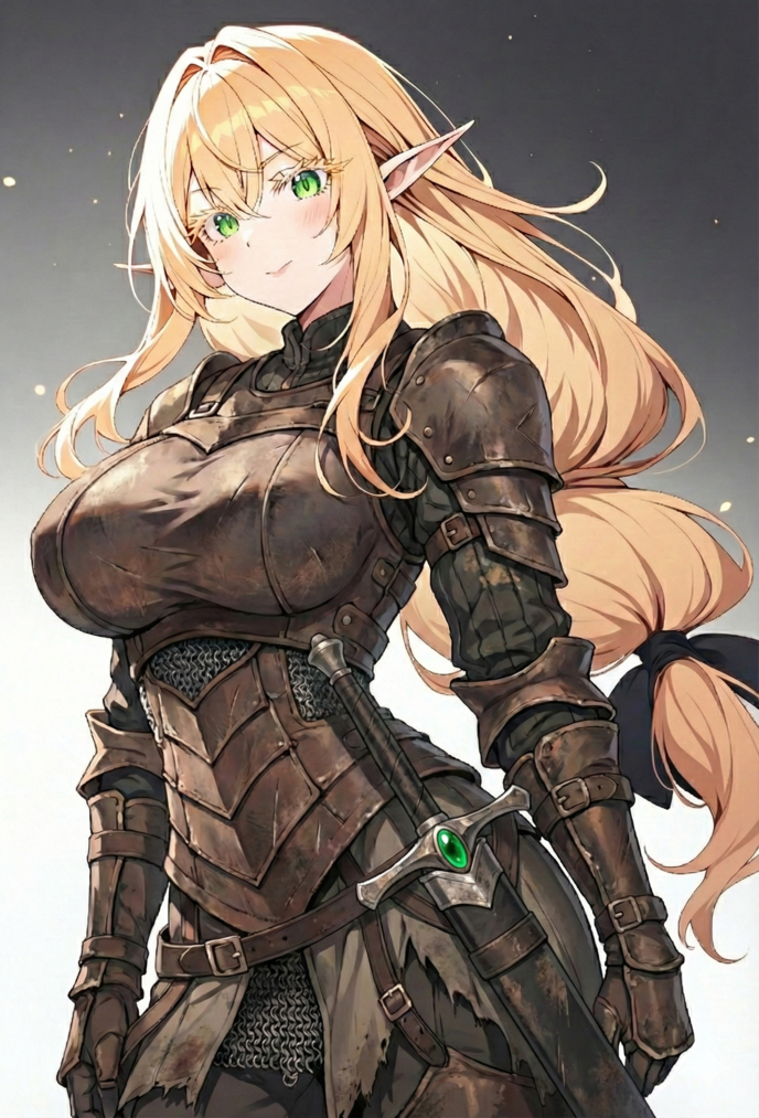 柔らかな肉が革鎧の内側で機能的に抑え込まれるたび、彼女の佇まいは、あざとい旅娘から凛々しい女戦士へと変貌を遂げていく。