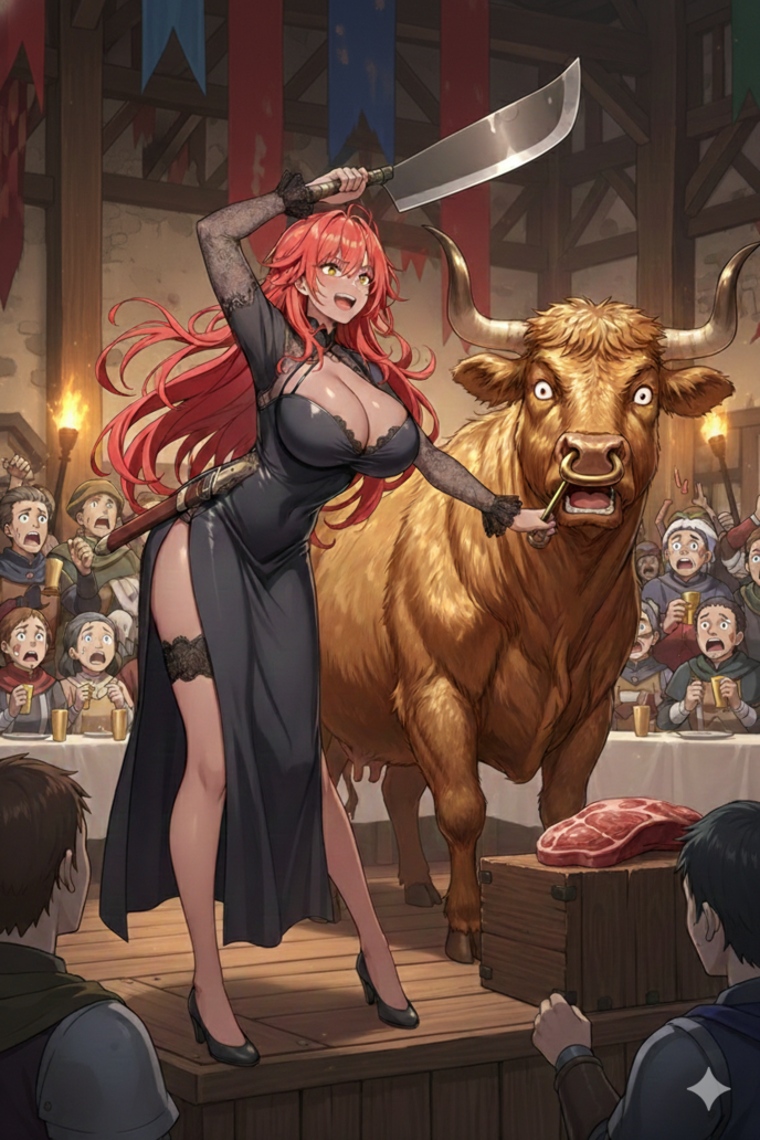 黒い衣装を着たシャルマーニは壇上に立ち、雌牛の乳房に勝るとも劣らぬ豊満な胸を誇らしげに反らしつつ、エルバニアから取り寄せた雌牛を宴会に参加した一同に紹介する。