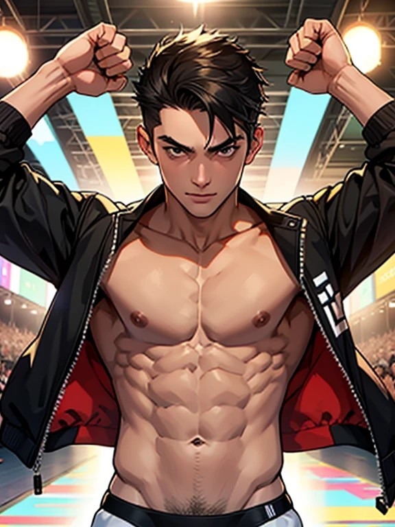 上半身裸の上にジャンバーを羽織り、筋肉をセクシーに見せる……