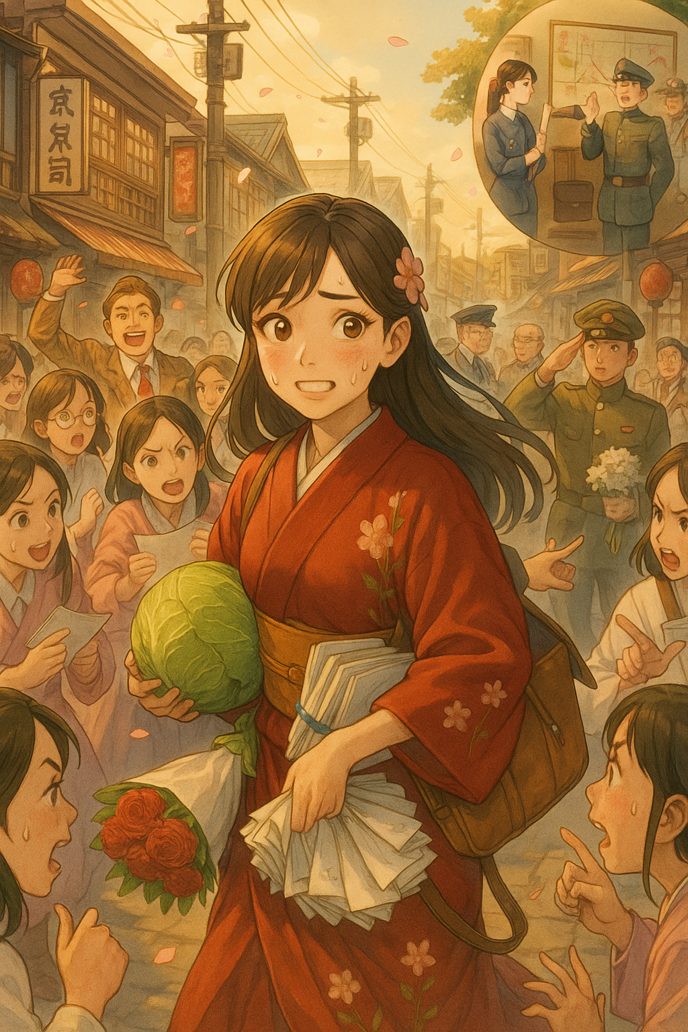 ぎりぎりで彼らをかわしていたはずが、なぜか私はキャベツを抱え、士官候補生から花束まで受け取る。両腕は完全に塞がり、追いついてきた女学生から渡された大量の手紙の山が足元に。