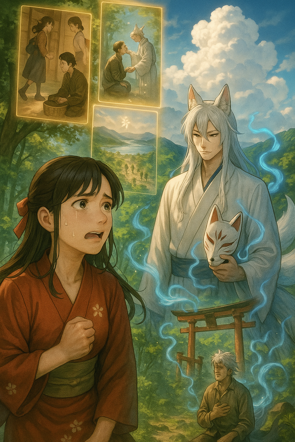 眼下には、諏訪の地が広がっていった。川は銀糸のように輝き、山々は神々の布が皺を寄せたかのように連なり、諏訪湖は鏡のように空を映していた。そして、飛翔した空で、彼は魂に会った。妻と子の。彼ら三人はともにこの美しい景色を眺め、心を打たれていた。三人はついに満足し、さらに高くへ飛んで行った。