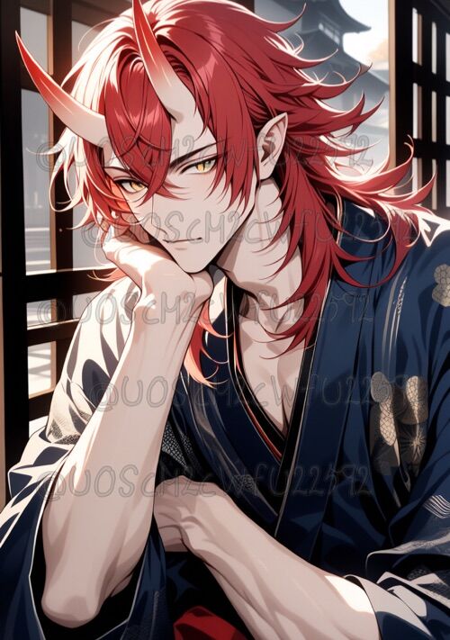 赤髪ミディアム、角二本、筋肉、舌が長い金色の猫目、鬼、筋肉質で少し逆三角形
