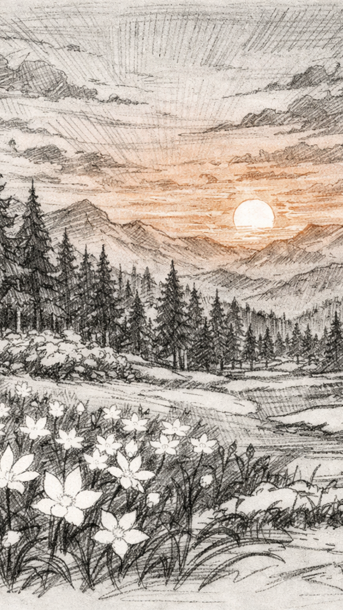 規則正しく伸びる木々は、まるで長い年月をかけて築かれた静かな要塞のようで、その奥には幾重にも重なった山々の稜線が、淡く霞みながら連なっている。地面には、溶け残った雪が白い傷跡のように点在して、この階層の気候を物語っていた。