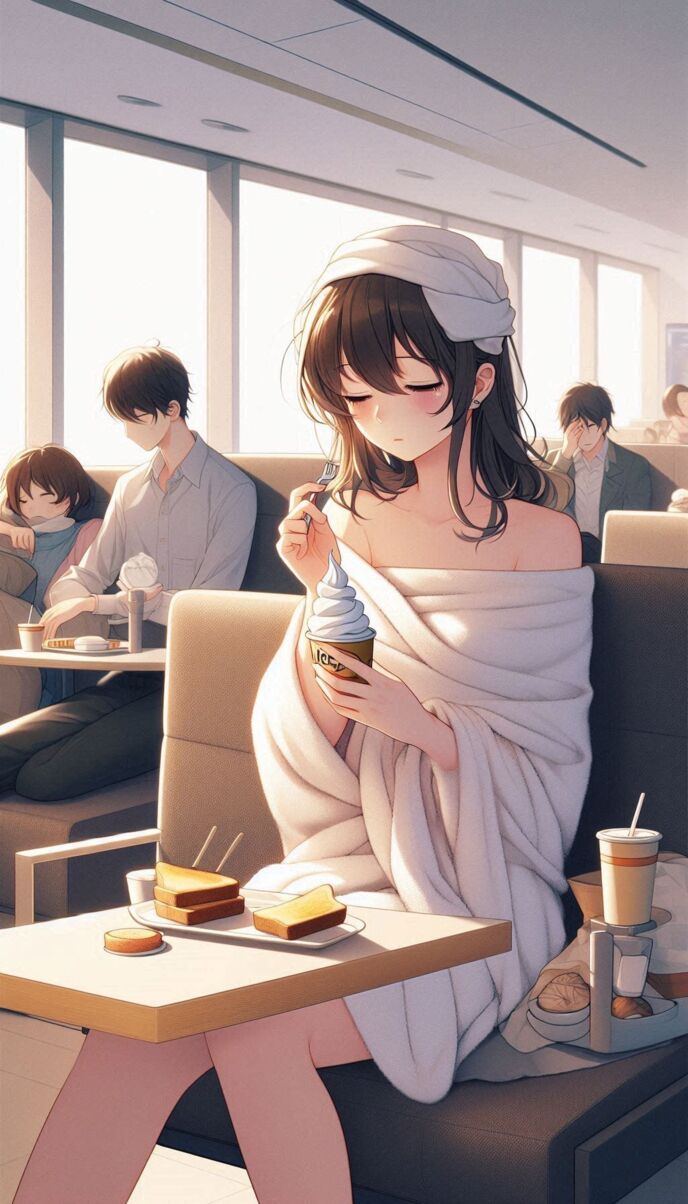 私はスーツを脱いで下着姿で、乾ききっていないタオルを手に取ってシャワー室に向かう。向かう途中で何人かの客に二度見されたが、何も言われなかった。みんな寝付けていない感じの目だった。目の下のクマがよく見えたから。
