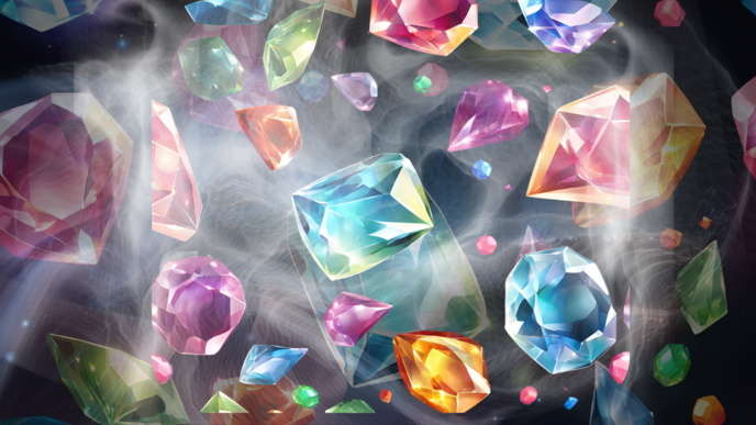 広く薄暗い空間に、まるで漂うかのように輝く無数の彩とりどりの宝石のような物が浮かんでいる。