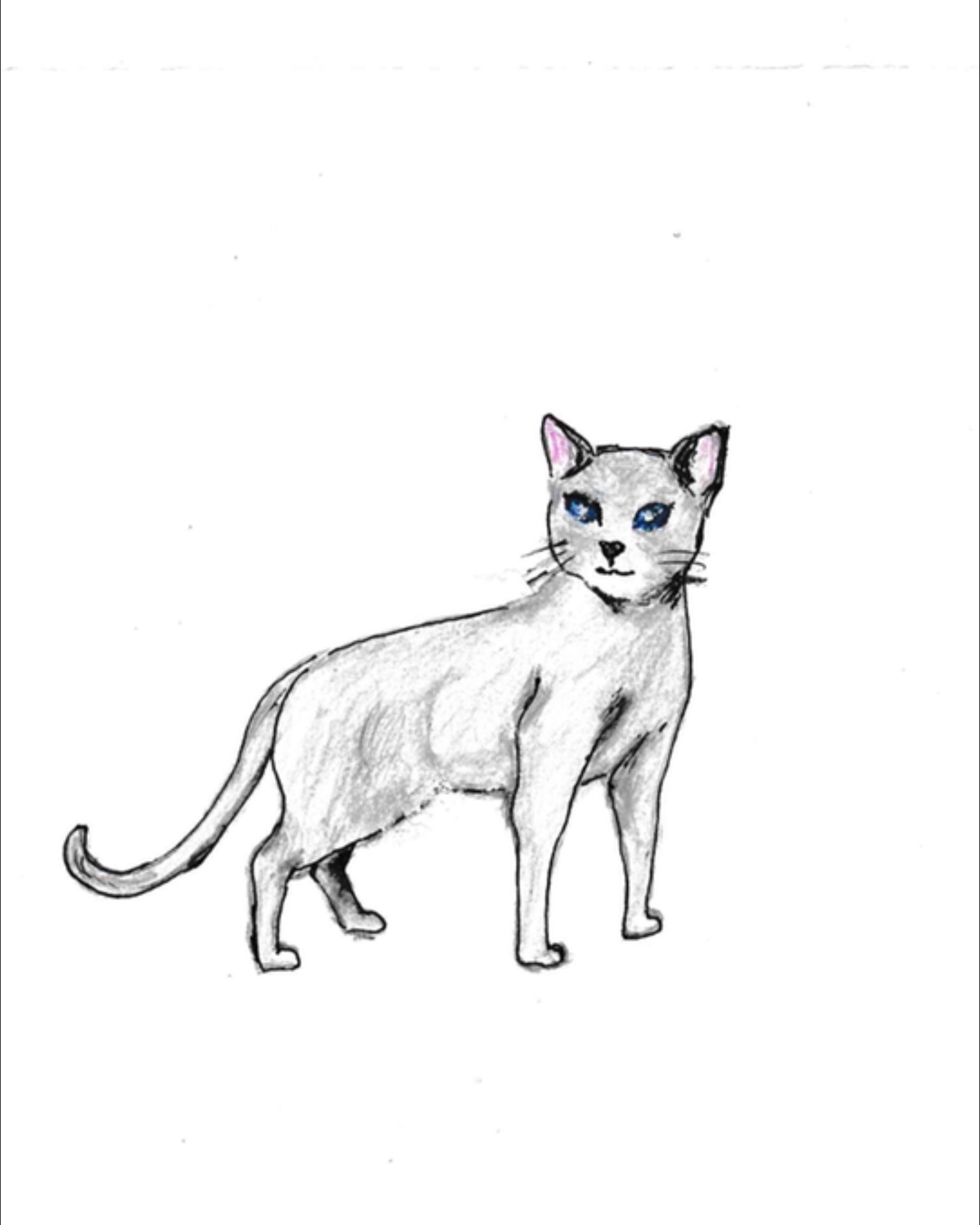 隣にいるのは、目がブルー、全身 灰色で長い尾の猫だった。