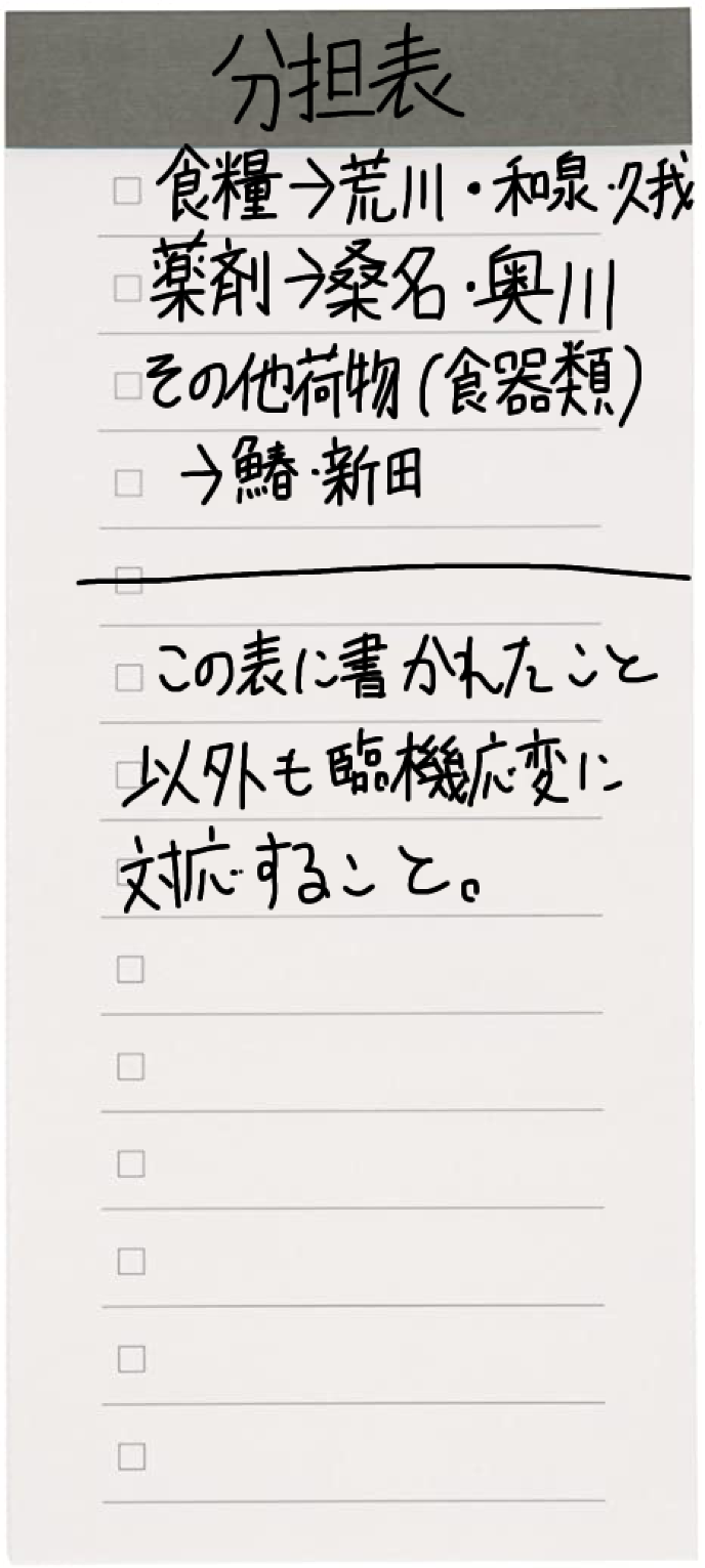 合流した8人全員があつまり、冬樹さんの話に耳を傾ける。彼が言うには「こういう状況だったら全員で役割を割り当てて効率よくさぎょうができるようにしないといけない」ということだ。全員が納得したように首を上下に揺らす。