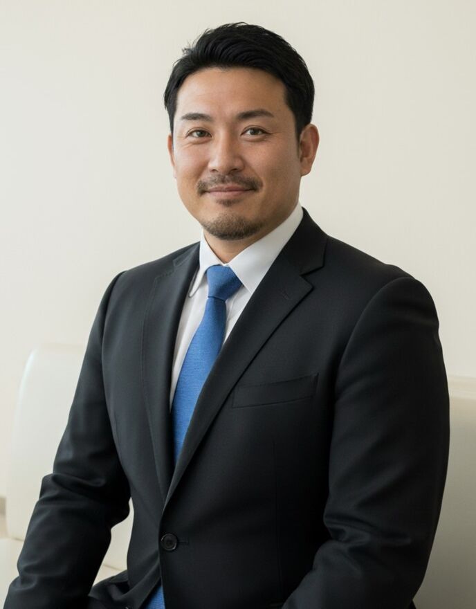 真面目だが強気で、どこか挑発的な笑みを浮かべる青年。