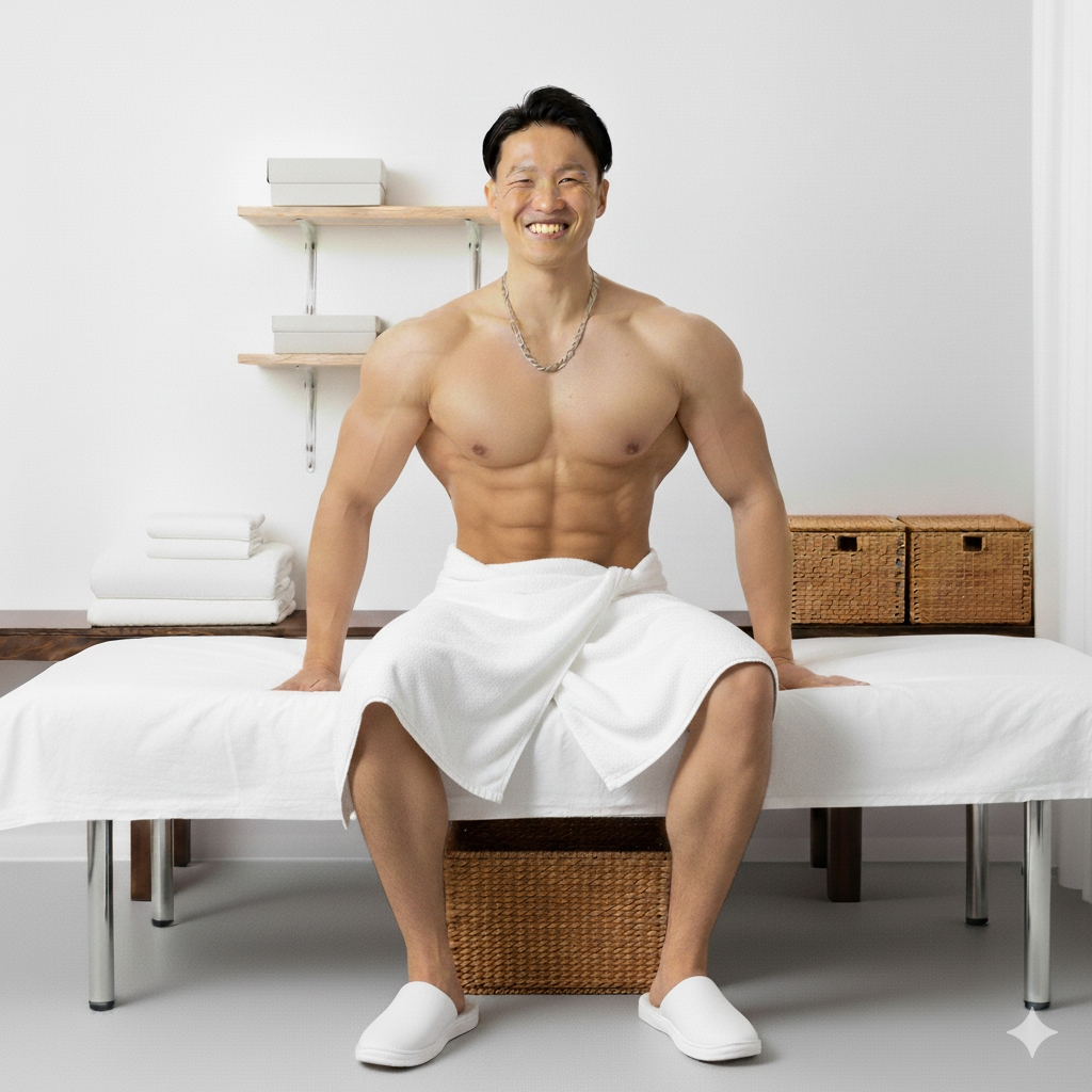 寝てたらやりたい放題なんだけどなー。と言ってもここはお店だし…。理性を忘れないように…マッチョイケメンに浮かれてしまいそう。
