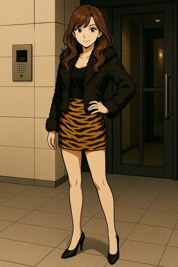 その女性は、茶髪の巻き髪ロング、虎柄のミニスカートに、毛皮付きのジャケット。