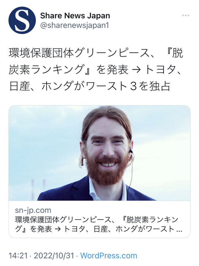 しおりを挟むグリンピースが発表した自動車企業のカーボンニュートラルランクは日本企業がワースト3。