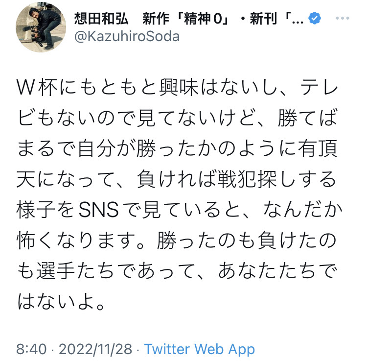 サッカーワールドカップ日本代表が第二戦のコスタリカに敗れた。そこでまたさまざまな思いが発信される。
