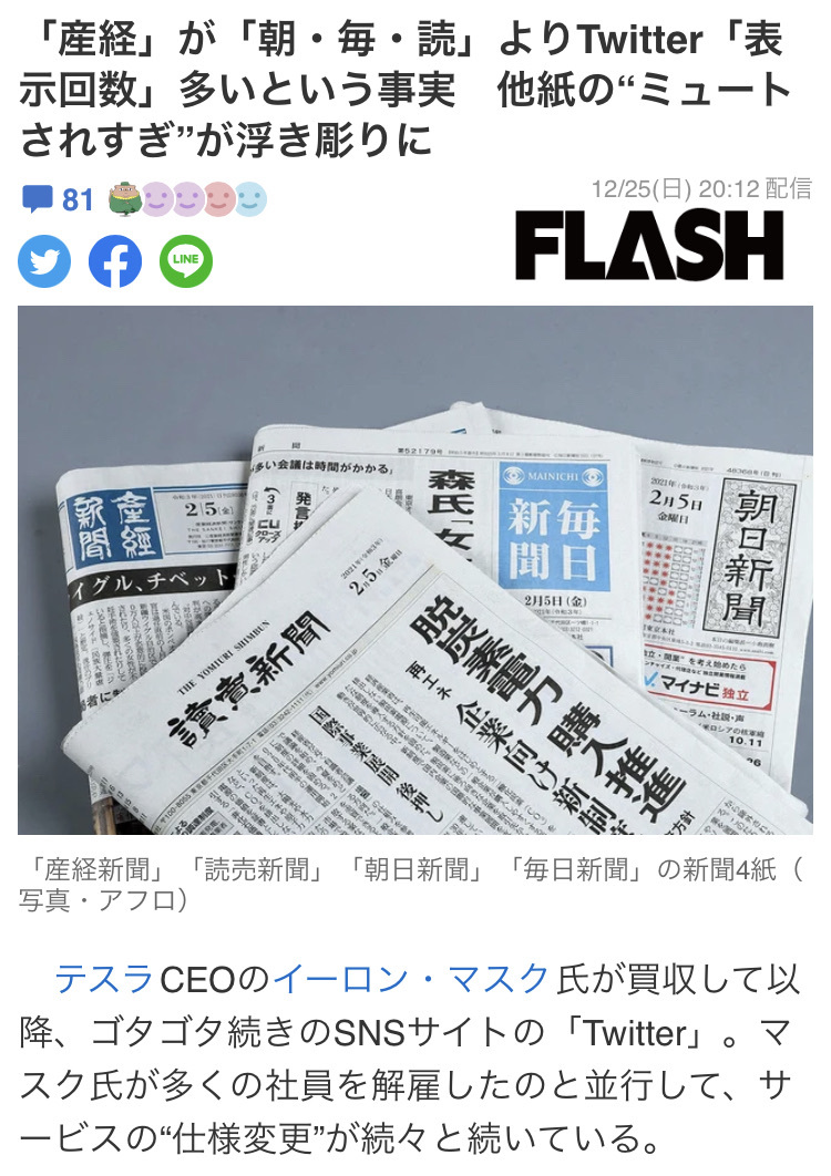 ツイッターでのインプレッション表示実装で、報道の冠たる新聞社各社のSNSフォロワーといいね数のギャップが嘲笑の的になっている昨今。