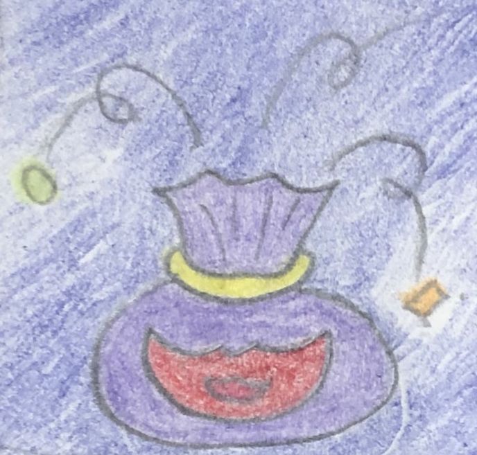 暗やみの中、むらさき色の、くちの絵の描いてある小さなふくろから、ポンポンと色んなものが出てきて、その出てくるものの中から「ほんもの」を見つけるというゲーム。
