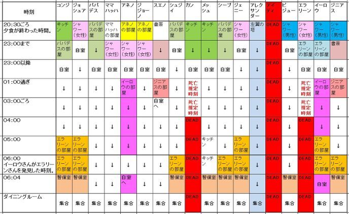 他の方は、イーロウさんはジニアスさん、ビジューさん、イーロウさんとともにシャワーを浴びられた後に、深夜1時過ぎまで自室で過ごし、アネノさんとその後朝まで一緒だったと言うことで、完全にアリバイありですね。