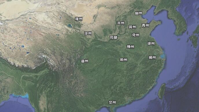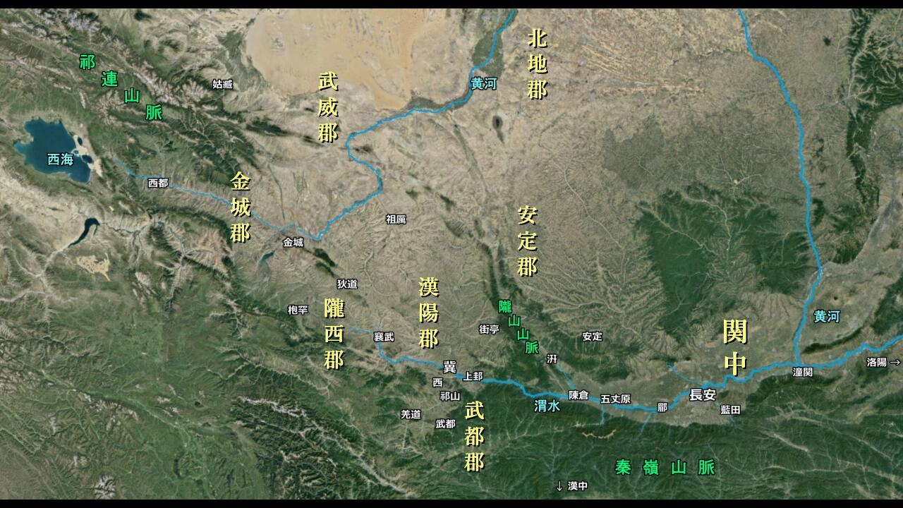 現代の衛星写真(Google Earthより)のおおよその位置に、作中年代である後漢時代の地名を配置しました。作中の地利把握の参考になれば幸いです。