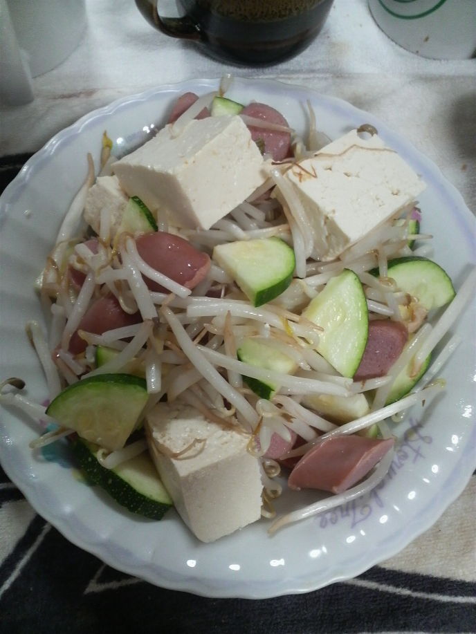 ウィンナー豆腐もやしズッキーニ塩胡椒炒め