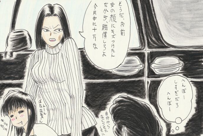 真理は、とめどなく溢れる鼻血を指の甲で抑えながら、血を流す口端をニヤリとあげる。一歩も引かなかったばかりか、全く動じた様子のない彼女の姿に恐怖を覚えた様子の男は、たじろいで後退りする。