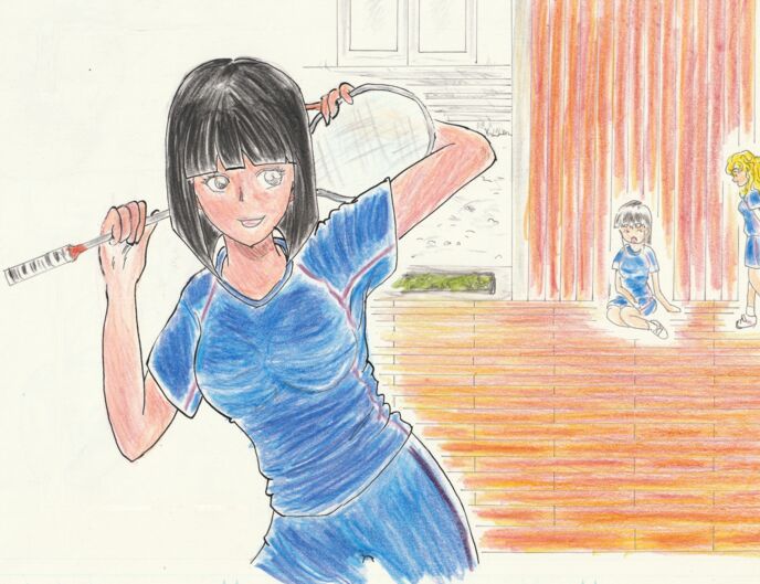 バトミントンエリアから、「奈緒ちゃん」と呼ぶ声がして、三人が振り向く。ラケットを上に掲げて軽く振りながら、原口アンジェリカ沙織が、サラサラなミディアムヘアを揺らしながら近づいてくる。