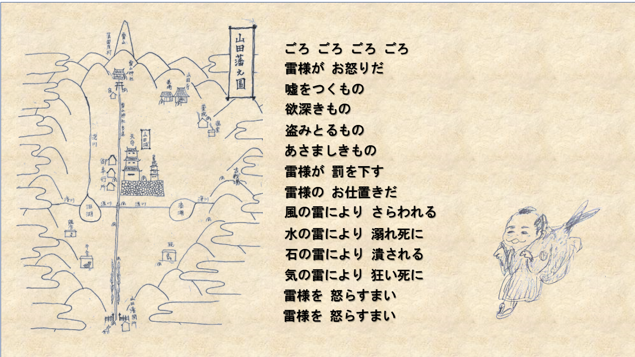 上記の名作の影響を受けて、『あはれの彼方』では、霊山雷山におわす雷様が『嘘を付くもの』『欲深きもの』『盗み取るもの』『あさましきもの』に制裁を加えるというわらべ歌を作りました。