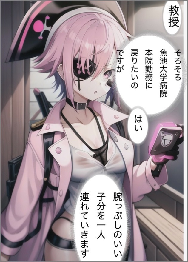 子分の必死の説得。イシヨ先生のワクチンも注入だ! なんか容器がくねくね動くぞ。振動機能もあるようだ。肩こりにも使えそうだ。おしゃれなピンク色。