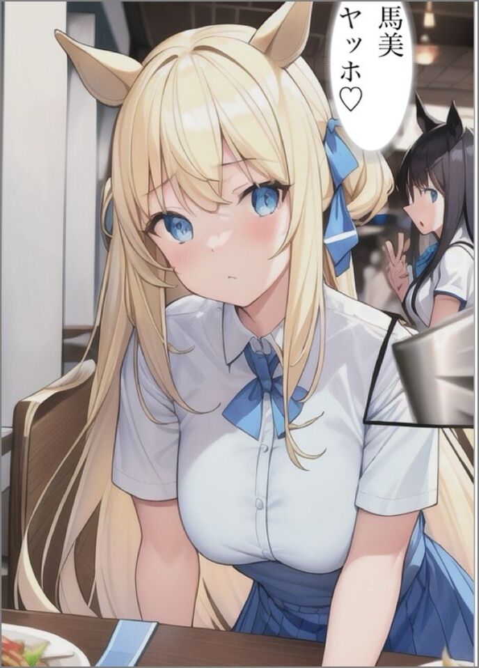 食堂で声をかけられる馬美ちゃん。
