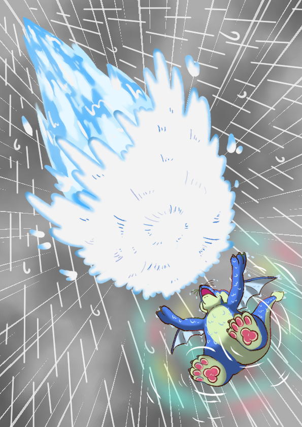(天より降りそそぐ雨のつぶてよ。ここに集い、ぼくを助けてくれ!)
