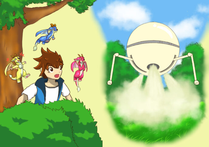 黄色い羽のフリーナが、ババッと、林の中から飛び出していきました。