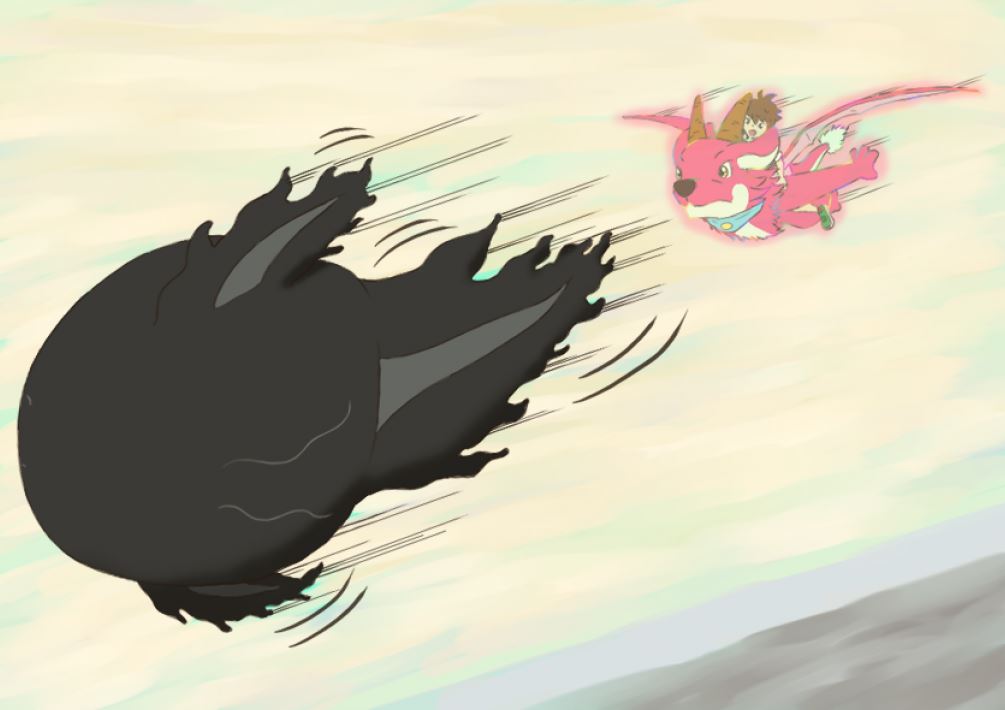 レンの一声にはっとしたフラップは、黒金魚のあとを追って飛びました。