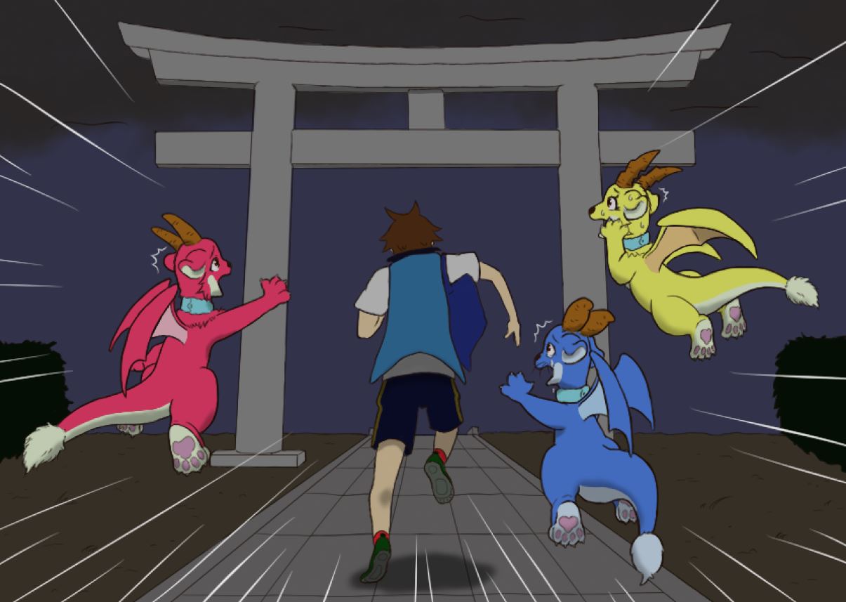 なぜか、ドラギィたちに背をむけて、参道の上へ歩いていきました。