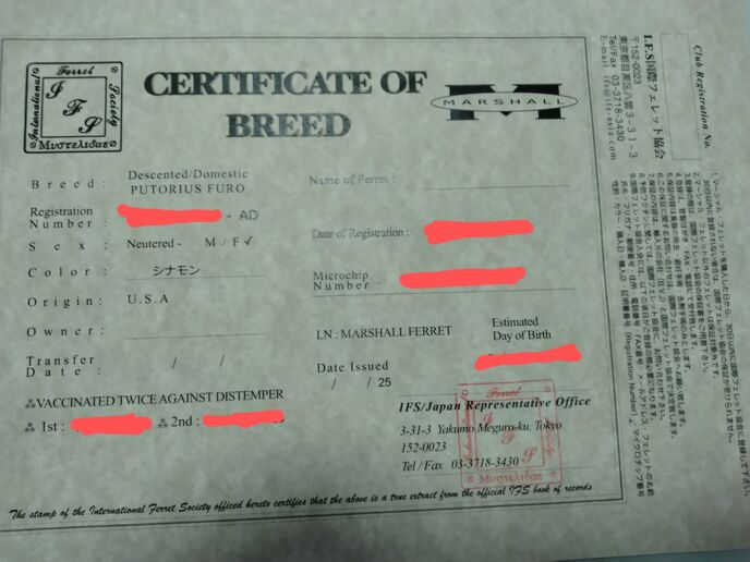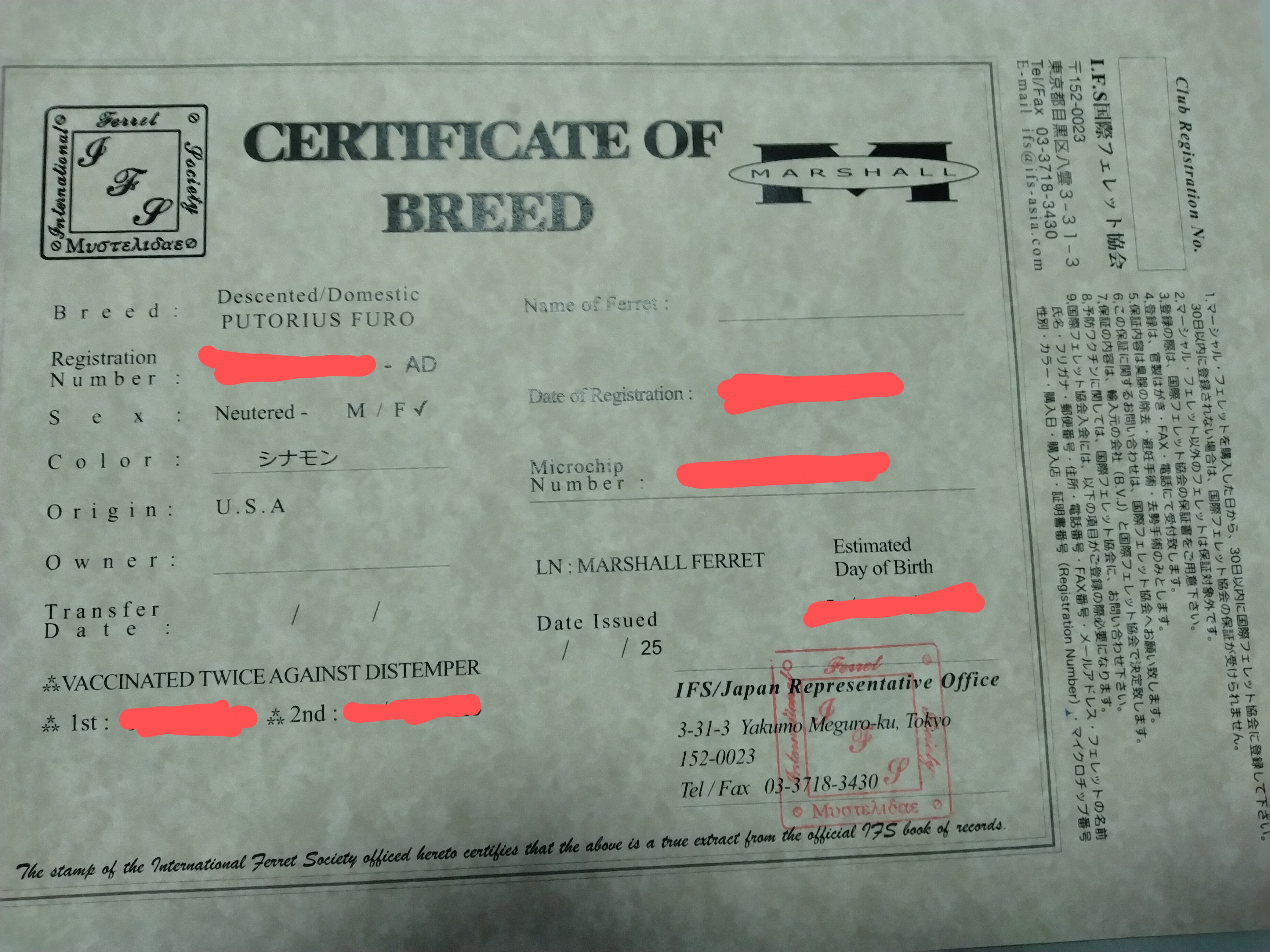 ちなみにIFS国際フェレット協会という場所が本体に添付している書類ですね。フェレさんは大体が輸入であり外来種なので…この書類にはつまり、前の飼い主(ここは、契約した業者が入ります)から誰が買い取ったか(つまり、私か母の住所、名前等です)、本体の誕生日…そして左の1番下の赤線(一応隠しました、いちごの個人情報なので)はアメリカで2回ワクチンを打ったよ、という証明書…まぁ、写真を拡大していただければわかりますが「生体証明書」になります。血統書みたいな。