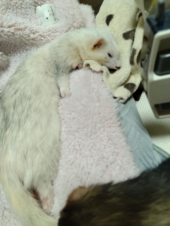 えー、フェレさんは「脱肛」というのがかなり多いのです。読んで字のごとく、腸が出たりします。おしりが梅干しになってまして、病院に行きました。