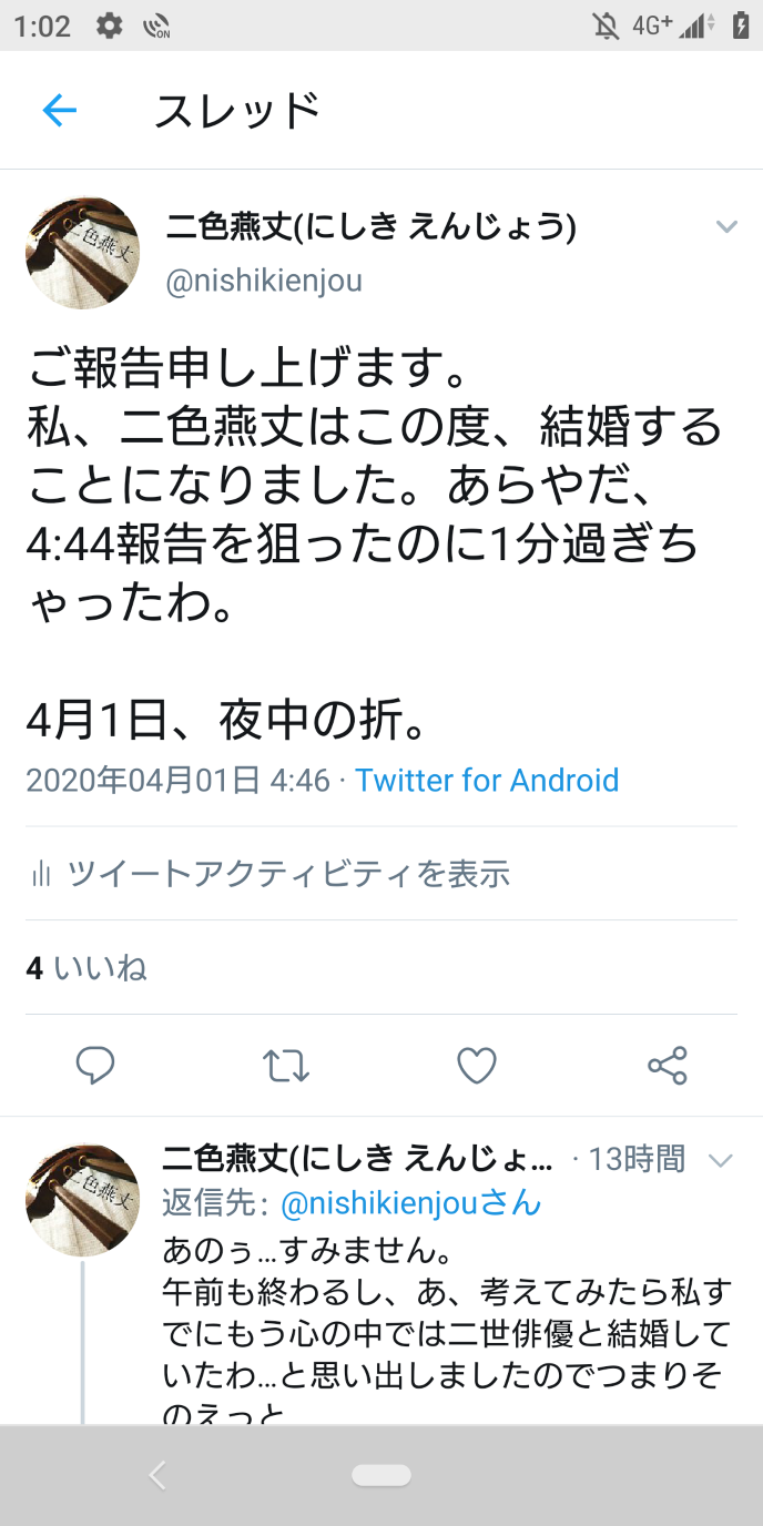 毎年ビビるんだ彼の冗談には。作り込みが凄すぎる。一昨年メンヘラ女子に成り済まして大幅にフォロワーを減らすくらいに(笑)いやあ畜生来年は打倒カミハテ。二色、エンターテイメント友人賞でした。拍手(*’ω’ノノ゙