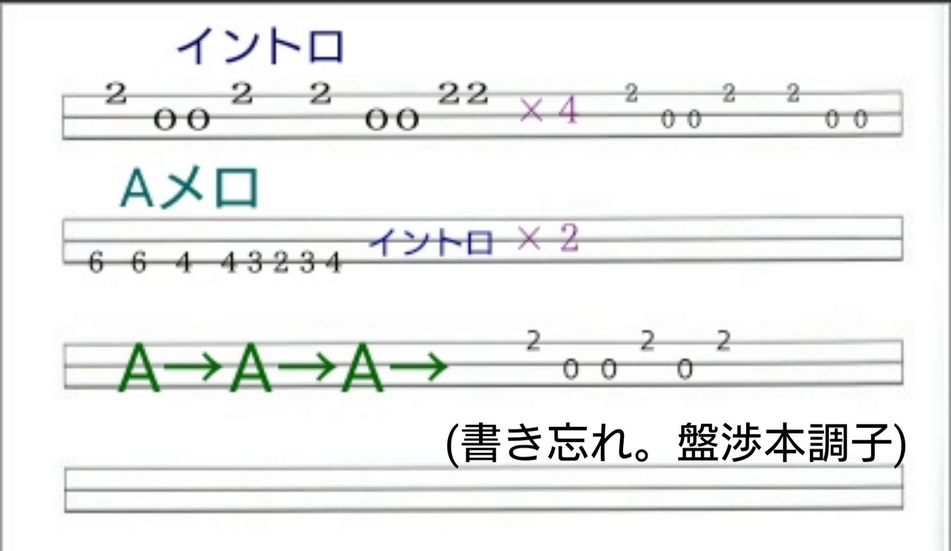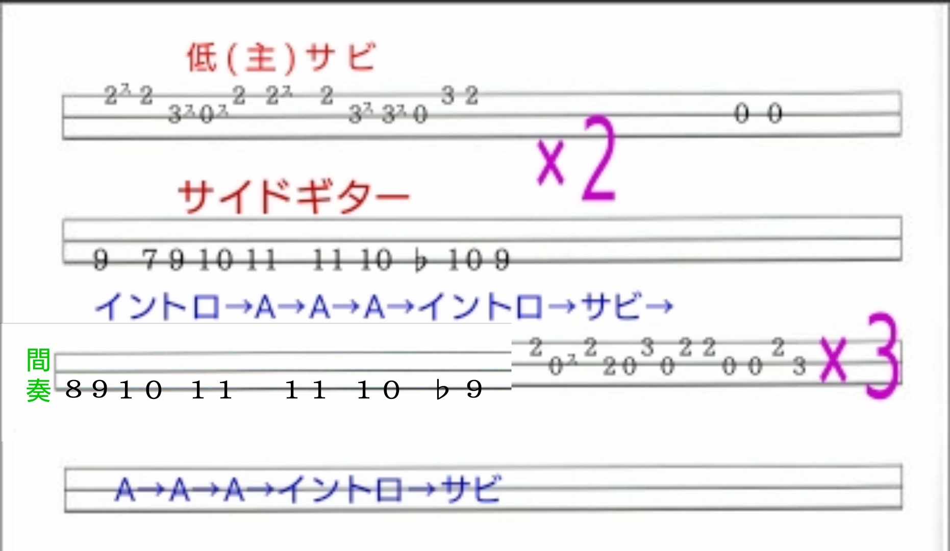 あ、さらにミスね。間奏の横の×3の位置です。張り直してある(3弦使ってるとこ)あそこが×3です。