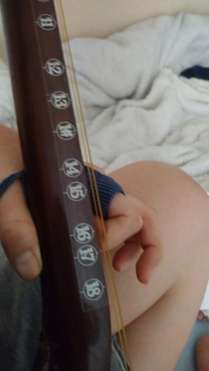 になるんですが、はい、あ、ちなみに引っ掛かってるのは友人の河野る宇さんが作ってくれた指かけです(笑)例えばですが一弦の3と二弦の0(ギターでいうところの解放弦)は音が一緒ですね。しかし私の楽譜、1本づつしか使っていない、それは何故か……