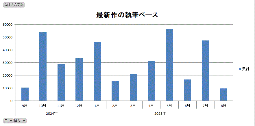 しかも執筆ペースにムラがあるようです。そこで私は、一月に何文字書いたか、調べてみました。