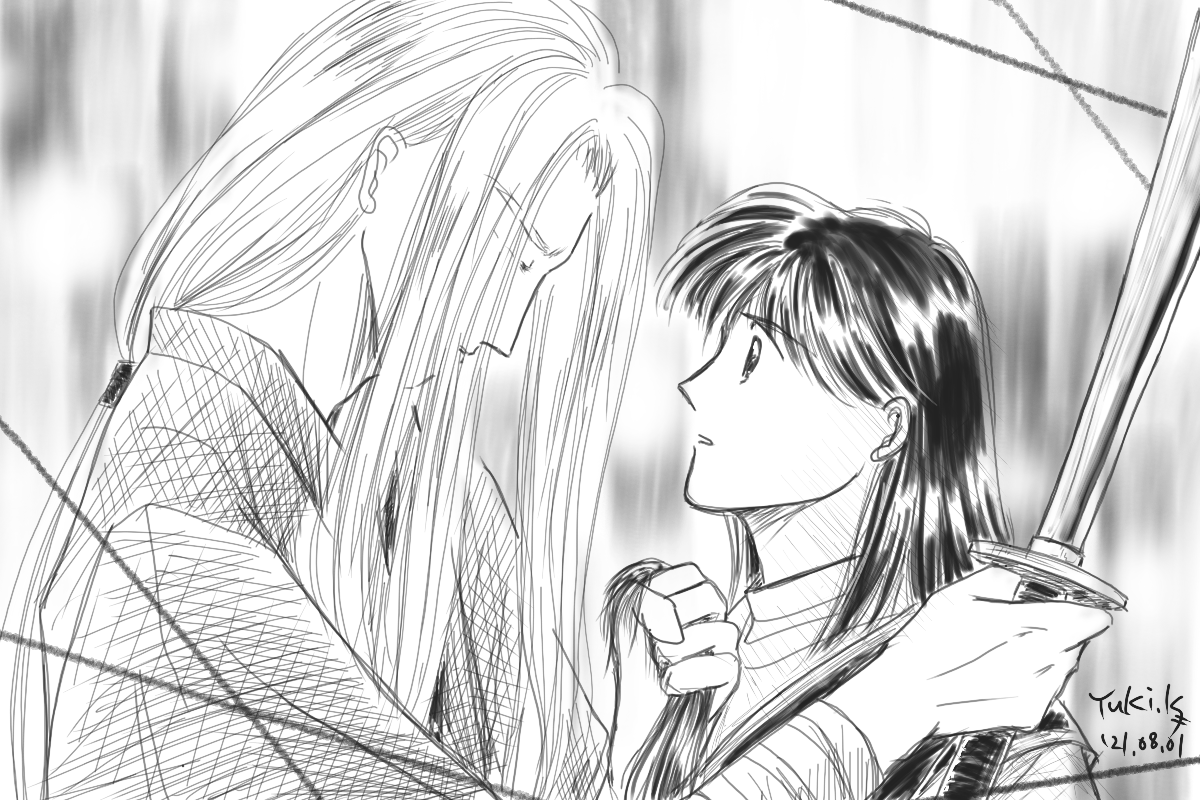靂は壁に掛けてあった刀を取り──素早く鞘から引き抜くと、左手に鞘を持ったまま、その刃を啼義に向けた。彼は身じろぎもしない。漆黒の瞳は、少しだけ怯えるような揺らぎを見せたものの、動くことなく自分を捉えている。