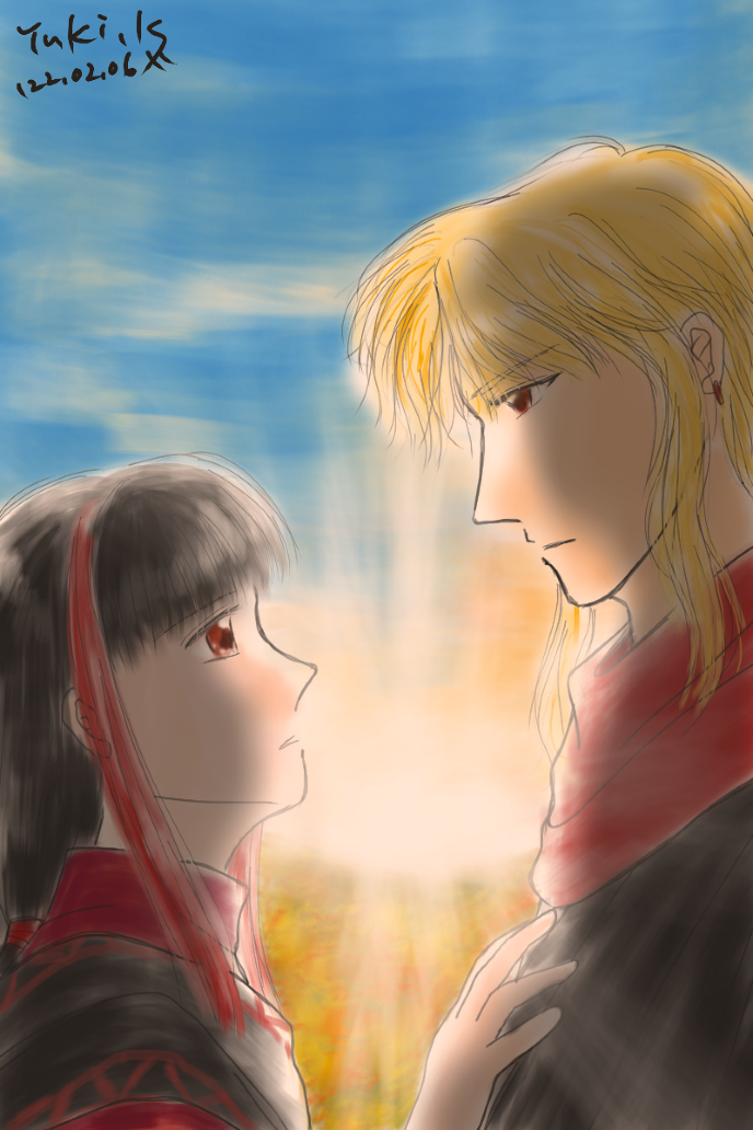 諦めて、腰に結んだ巾着の中にしまう。すると、結迦が不意に彼の金の髪に手をかけ、その背に流した。突然のことに身をこわばらせて反応できずにいるうちに、彼女は後ろに回って、手にしていた紐で、彼の髪を括った。