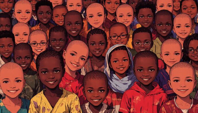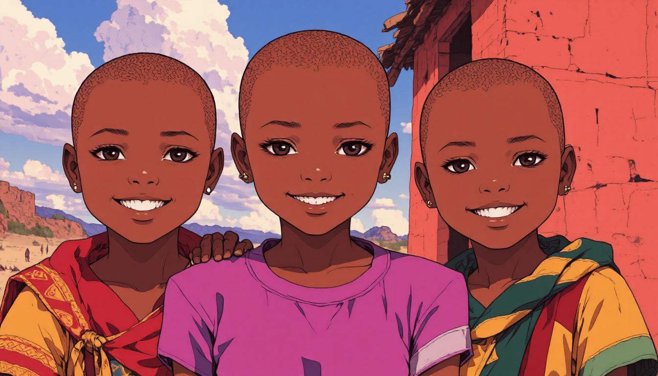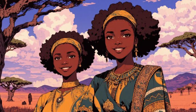 笑顔のツーショット。腰から上までの画角。雰囲気はAfricaの民族。髪型、服装もアフリカ民族衣装。アフリカ人の若い男女。背景はサバンナ