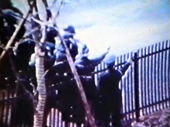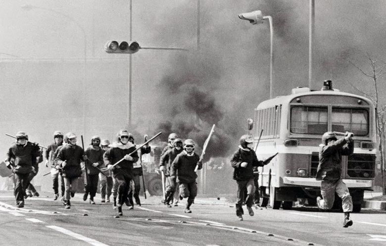 火炎ビンの残り火がくすぶっている戦闘直後の瞬間に、地下部隊が突っ込んできた。トラック部隊の仲間が、立ち上がって両手錠のまま合流しようとする。