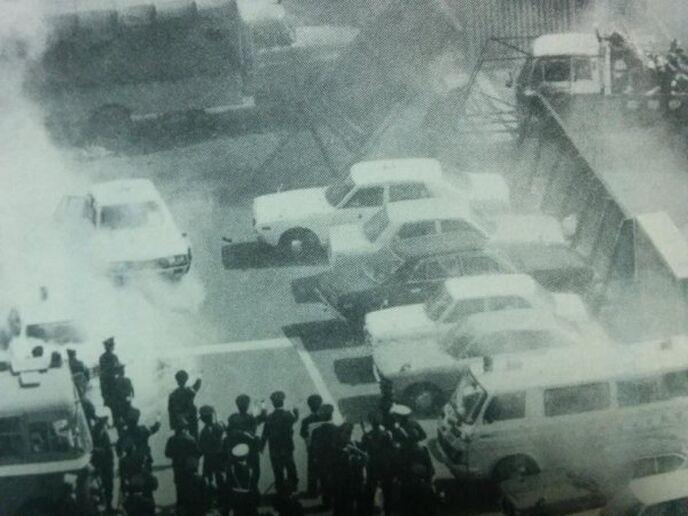 管制室への進入路を探している間に、下階の機動隊が階段を上ってきた。阻止部隊が張りついて、手当たり次第にあらゆる物を投げつけ、最後の火炎ビンを投擲、炎上させる。もっと投げる物はないかと周囲を見回すと、壁面塗装用のペンキ缶が放置されている。そいつを投げ落とすと火炎ビンの炎が引火し、下階は火の海になった。どす黒い煙が噴き上がってくる。機動隊は、完全に足止めされた。