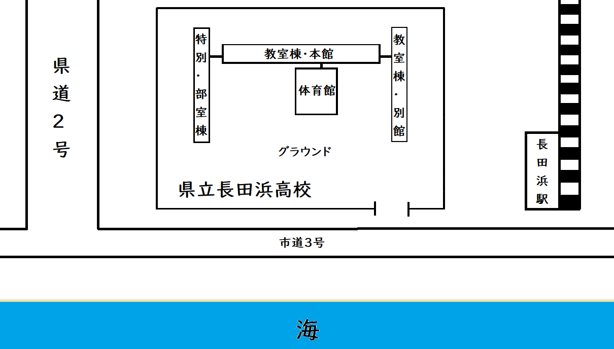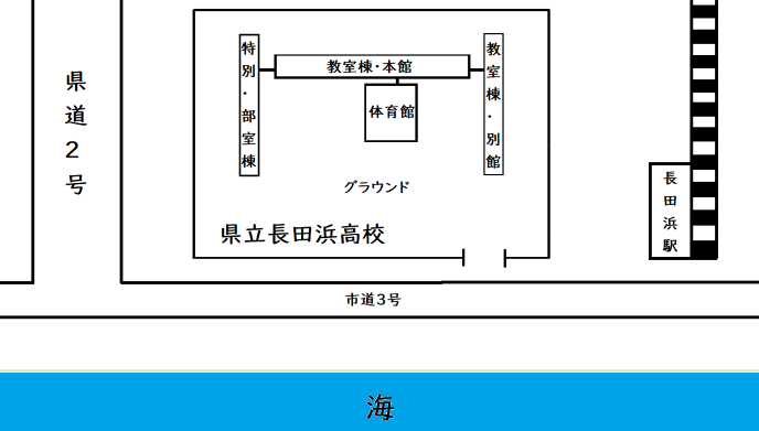 目の前には校名の由来にもなっている、長田浜が色がっていて、その先には海も見える。